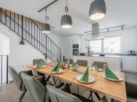 Living room with sitting area and television. Fully equipped kitchen with four induction hobs, microwave, refrigerator with freezer compartment, dishwasher, coffee maker (cups and filter), toaster, kettle and dining area.