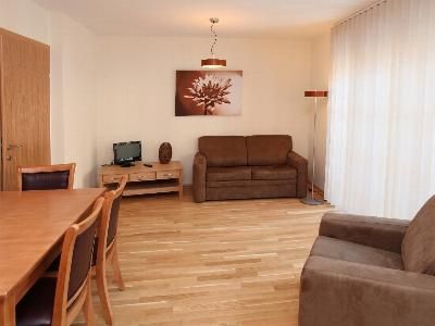 Modern, cozy living room with sitting area, television and dining area. Fully equipped kitchen with, among other things, electric hotplates, oven, microwave, refrigerator, dishwasher, toaster, coffee maker and kettle. There is also Wifi and a balcony or terrace.