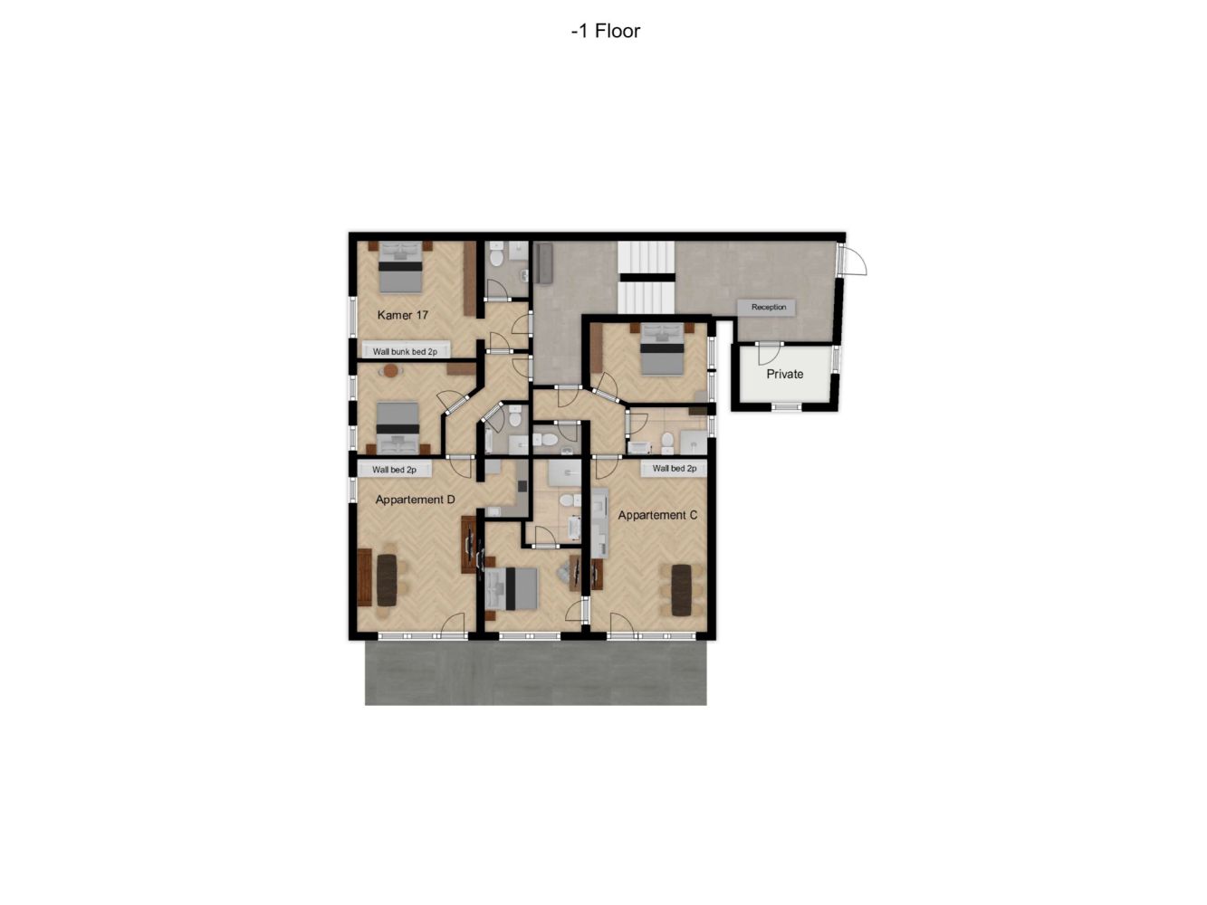 On the second ground floor (-2) you will find the sauna and a 6-person apartment. The apartment has a living room with a 2-person fold-out bed and two bedrooms, one with a double bed and one with two single beds. Bathroom with shower and bath. Separate toilet. This apartment also has a small private terrace.