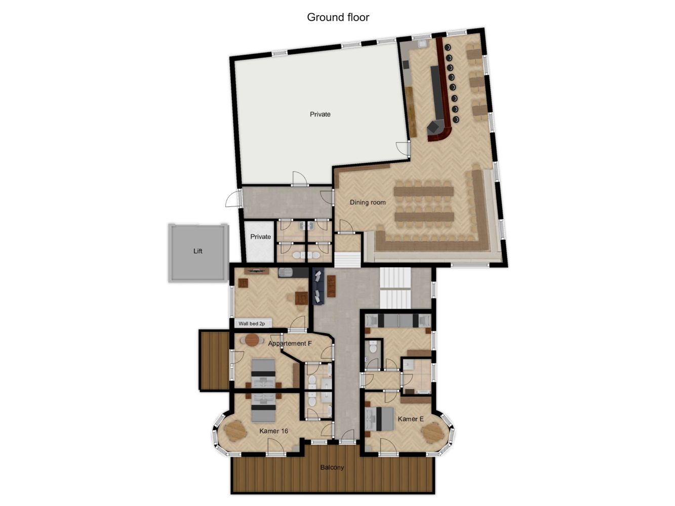 On the first floor you will find the common dining/living room with spacious dining areas. Furthermore, on the first floor you will find a 4-person apartment, a family room and a separate spacious bedroom. The 4-person apartment has a living room with a double fold-out bed, a bedroom with a double bed and a bathroom with shower and toilet. The family room has two bedrooms, one with a double bed and one with two single beds, a bathroom with shower and a separate toilet. The separate but spacious bedroom has a double bed, single sofa bed and a bathroom with shower and toilet.