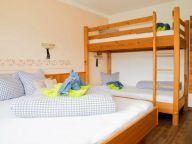 Two bedrooms, one with a double bed and one with a double bed and bunk bed. Bathroom with shower and toilet.