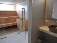 Bedroom with double bed, bunk bed and television. Sauna and ski storage with ski boot dryer.
