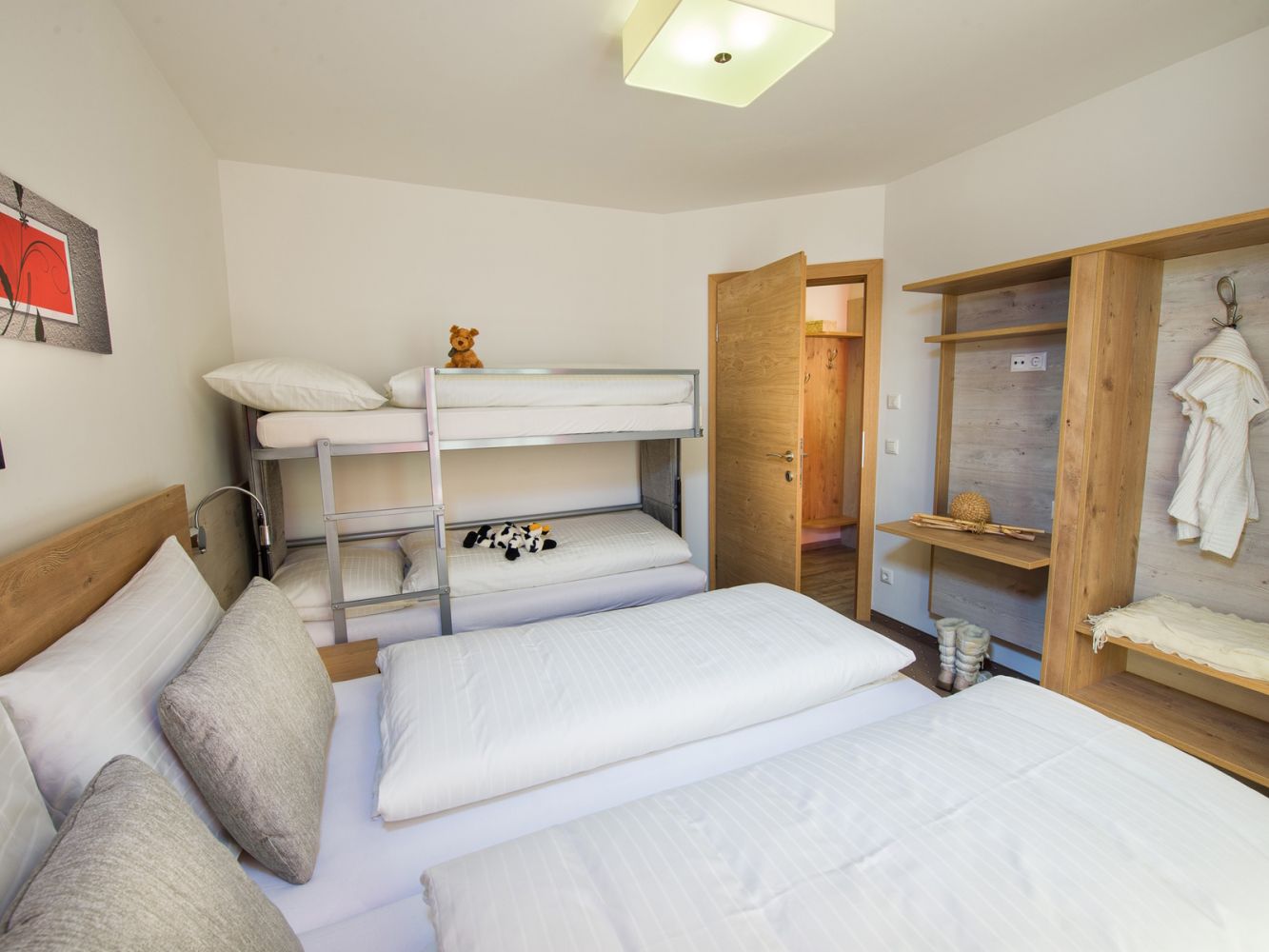 Bedroom with a double bed and a bunk bed or a sofa bed. Bathroom with shower and toilet.