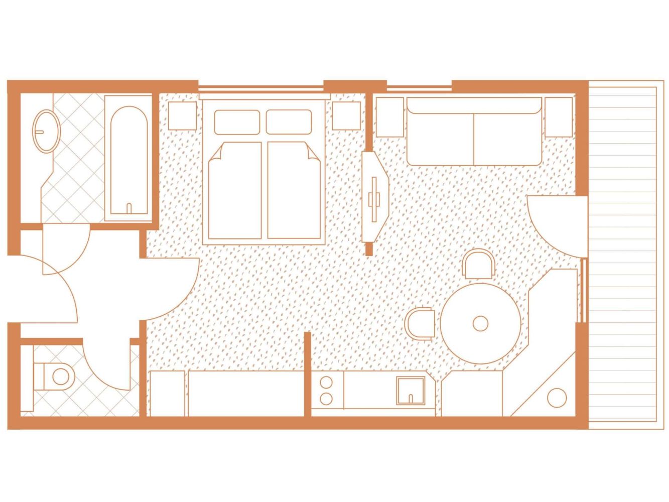 The apartment consists of a living/sleeping area with a double bed and a sofa bed, there is a bathroom with bath/shower and toilet.