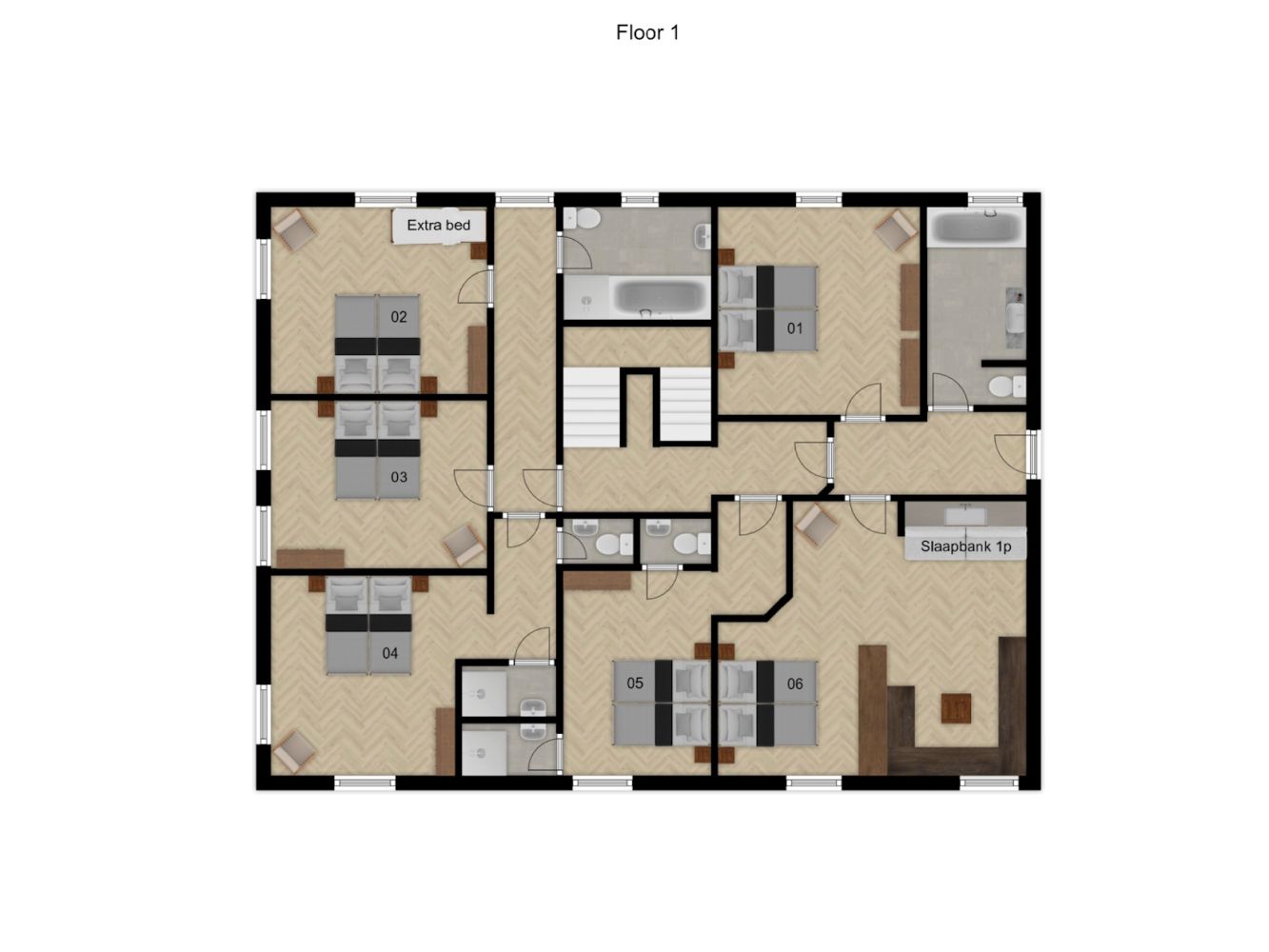 On the second floor are six bedrooms, two with a double bed and en-suite bathroom with shower and toilet. Four bedrooms with a double bed, one with the possibility of an extra single bed. Two bathrooms, one with bath and toilet and one with bath, shower and toilet.