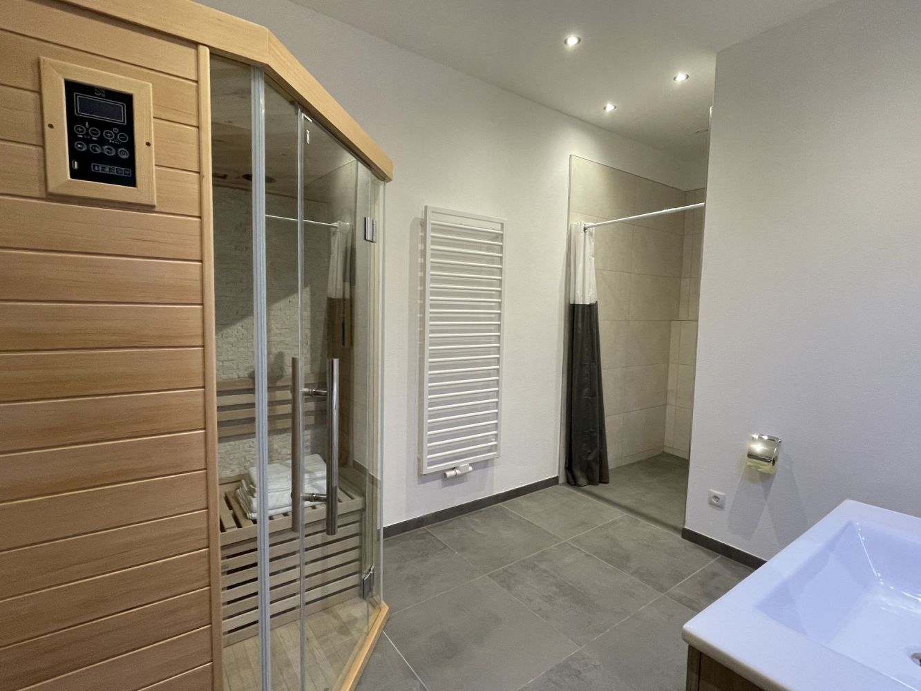 Modern, cozy living room with a comfortable seating area and a television. Open kitchen with, among other things, a dining table, ceramic hobs, oven, microwave, toaster, kettle, coffee maker and a dishwasher. Through the living room there is access to the terrace. This apartment has a wonderful sauna (for a fee), after a day full of snow activities you can relax your muscles here and reminisce about the day.