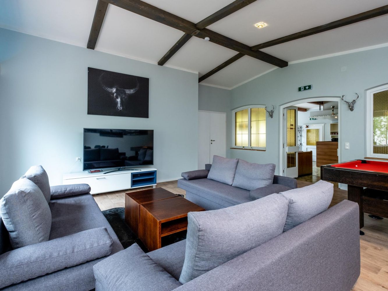Living room with sitting area, television, pool table and dining area. Fully equipped kitchen including double hob, two ovens, two fridges, two dishwashers, kettle, toasters, coffee maker (pads) and coffee maker (filter). There is also a large dining room, bar and toilet.