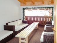 Living room with sitting/dining area, television and typical Austrian stove. Fully equipped kitchen with hotplates, oven, microwave, refrigerator and dishwasher. Furthermore, there is a spa with sauna and shower, a terrace with deck chairs/garden furniture, a ski and shoe storage and a shoe dryer.