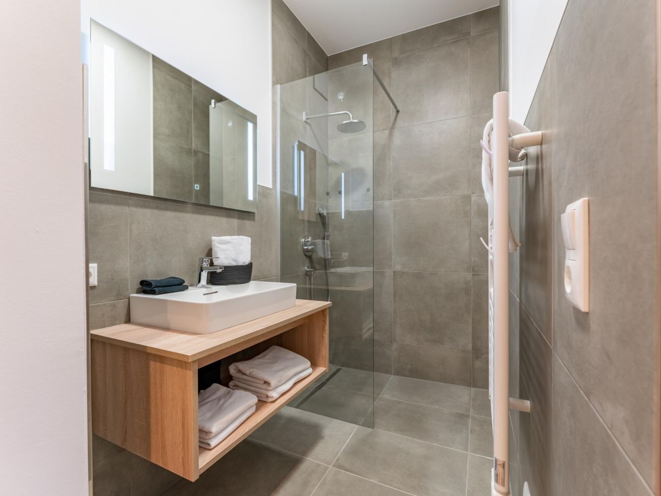 Three bedrooms, each with a double bed, television and en-suite bathroom with shower and sink. Separate toilet.