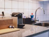 Modern kitchen with induction hob, fridge freezer, microwave, toaster, coffee maker (Nespresso), kettle and dishwasher.