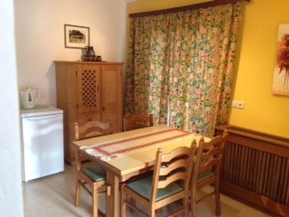 Living room with 1-person sofa bed, television and dining area. Fully equipped kitchen with hob, oven, refrigerator, dishwasher, coffee maker and kettle.