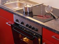 Behind the long cabinet wall in the living room is the first (open) bedroom with 2 single beds and an en-suite bathroom with bath and toilet. A few steps lead to the front room of one of the towers of the castle where there is a bedroom with two single beds. Behind that is the third bedroom (tower room) with a double bed and an en-suite bathroom with bath and toilet. For the seventh and eighth person there is a double sofa bed in the living room.