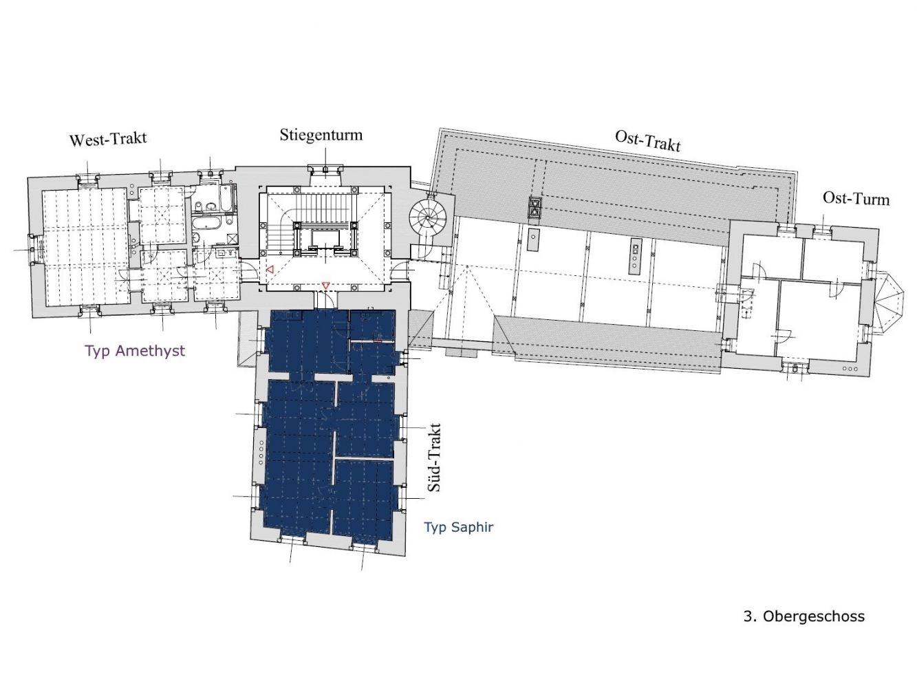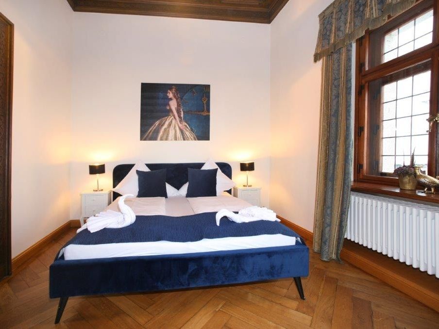 Based on the precious gemstone sapphire, this apartment is decorated with generous dark blue tones. Located on the third floor, in the south wing of the castle, the apartment offers a magnificent view toward Zell am See and the slopes beyond.