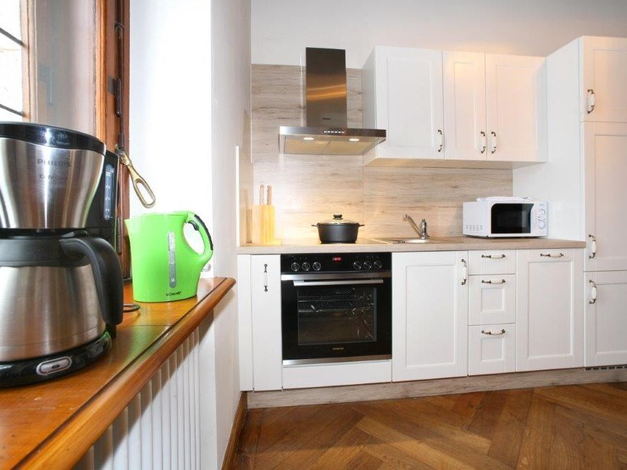 The gracious apartment features a high ceiling with wooden beams and has a spacious living room with a comfortable seating area, flat-screen TV and dining area. The kitchen is fully equipped including a 4-burner electric stove, oven, microwave, fridge freezer, dishwasher, toaster, coffee maker and kettle. Furthermore, there is Wi-Fi.