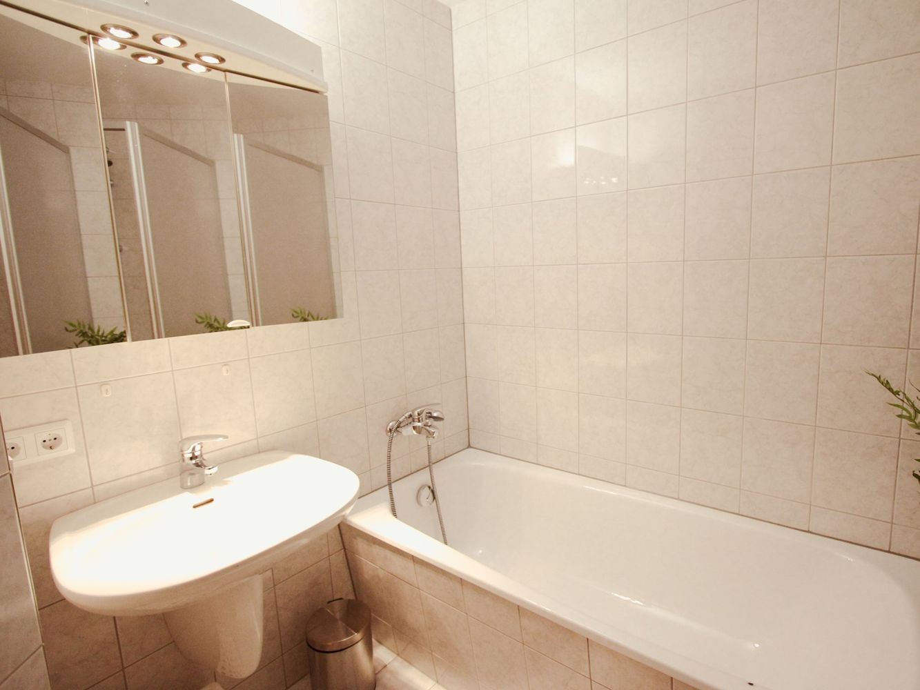 Sitting area with large sofa, television and access to the balcony. Modern kitchen with typical Austrian dining area. Kitchen with an induction hob, oven, microwave, refrigerator with freezer, filter coffee maker, Nespresso coffee machine, kettle and dishwasher.
