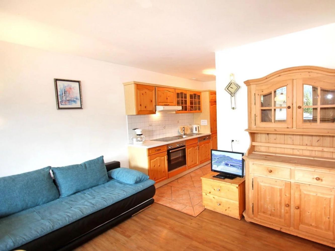 Nicely furnished living room with a sitting area with a 1-person sofa bed, television and a typical Austrian dining area. A complete kitchen with electric cooker, fridge with freezer, oven, dishwasher, toaster, kettle and filter coffee maker. Furthermore, this apartment has a south-facing terrace with seating.