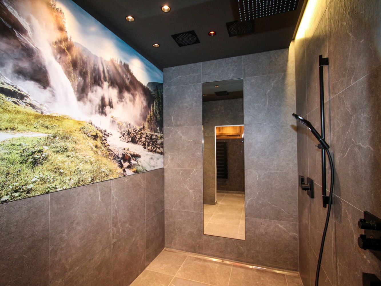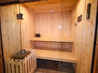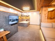 Wellness with sauna, steam bath, whirlpool, rain shower, relaxation chairs, television and hotpot on the terrace.