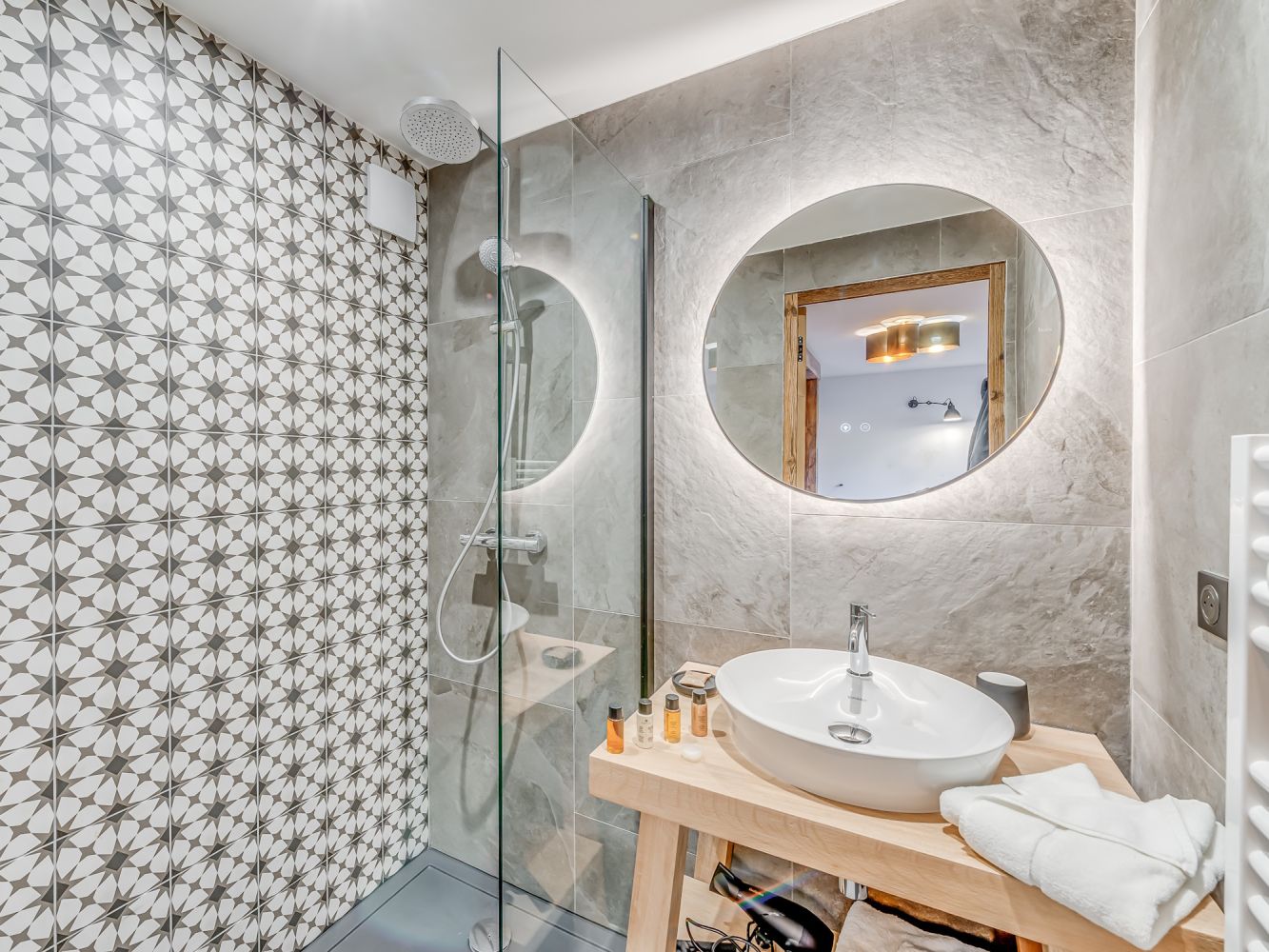 The first floor features a wellness area including a sauna, salt wall, hammam, whirlpool, ice cabin and a luxury sensory shower with music therapy. You will also find on the first floor the ski lockers with ski boot warmers and a laundry room with washer and dryer.
