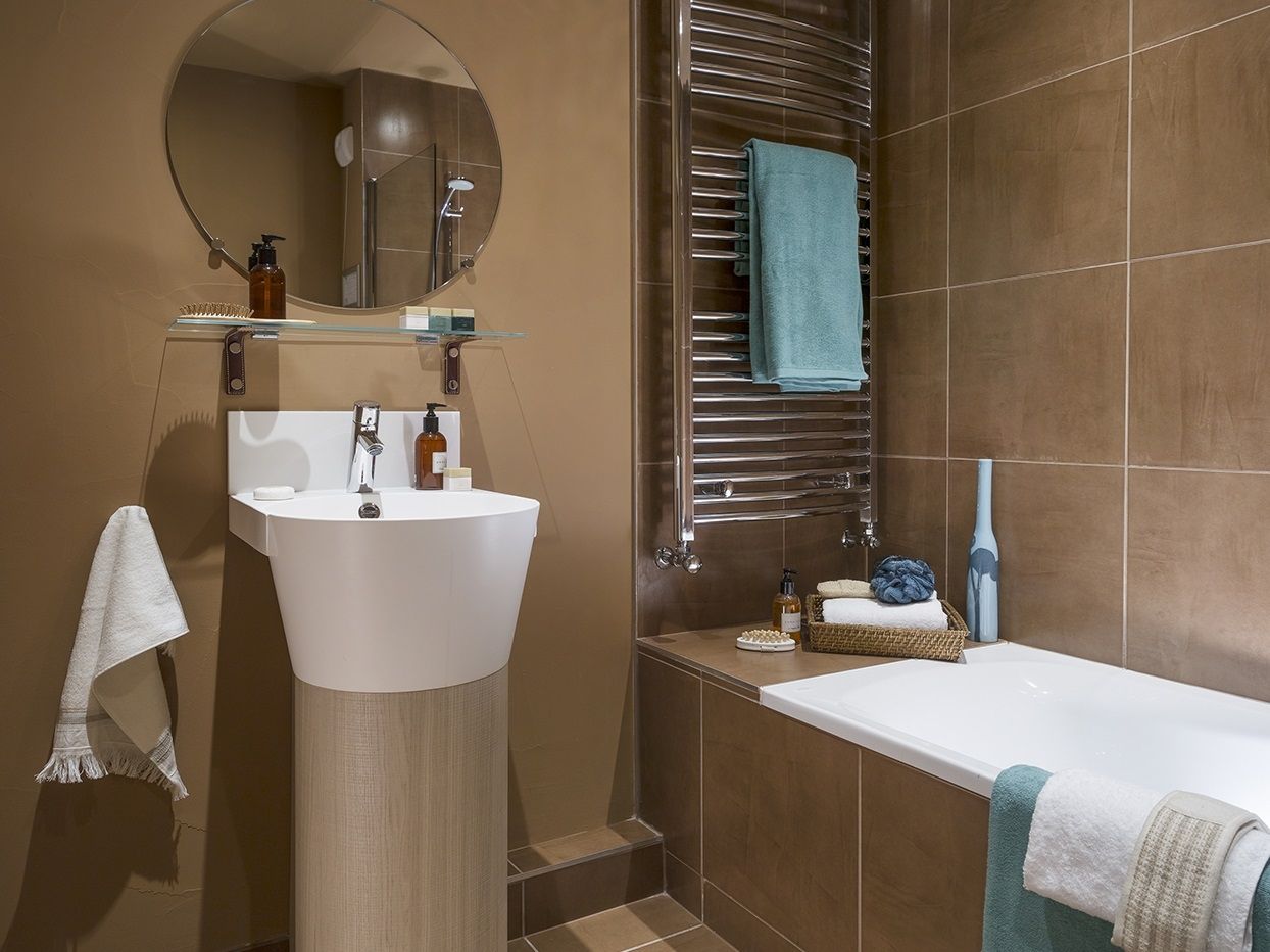 Two bedrooms, one with a double bed. The second bedroom has two single beds, but no window. Two bathrooms, each with bath or shower and toilet.