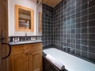 On the first floor you will find stylish living room with comfortable seating area, fireplace, television and exit to the balcony. The kitchen is fully equipped including a 4-burner stove, refrigerator, freezer, oven, microwave, Nespresso coffee maker, coffee percolator, toaster, kettle and dishwasher. Furthermore, on the first floor you will find the entrance with ski storage and ski boot warmers and a bedroom with king size bed, fireplace and en-suite bathroom with bath, shower and toilet.