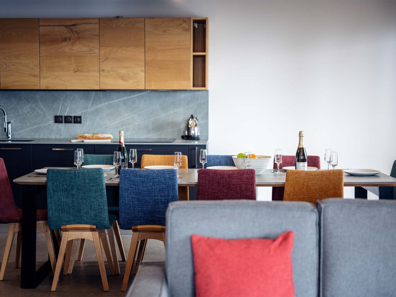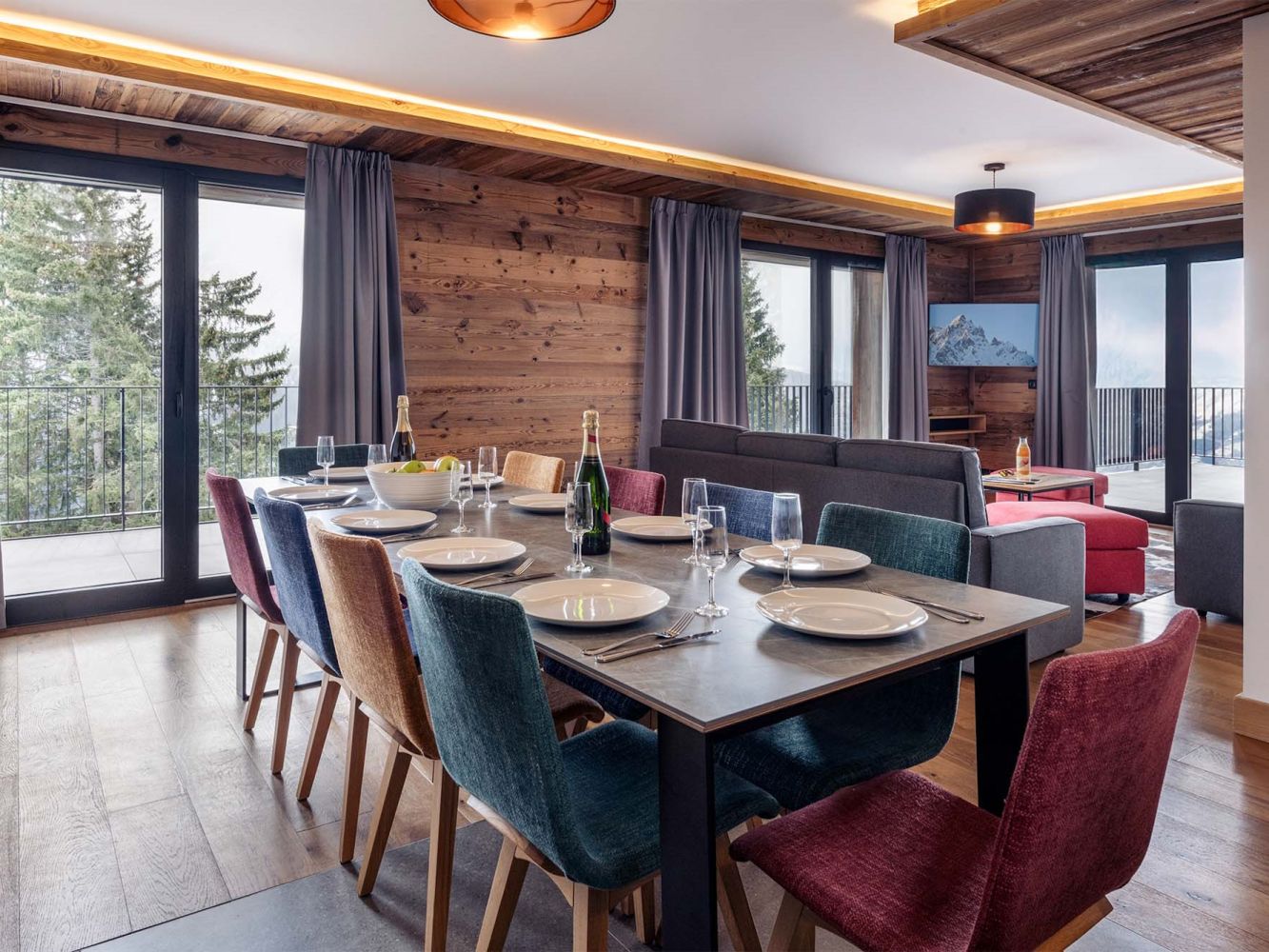 Living room with spacious sitting area and flat screen television. The dining area has a large table in the fully modern equipped kitchen including a stove, refrigerator, microwave, filter coffee maker, Nespresso coffee maker, kettle and dishwasher.
