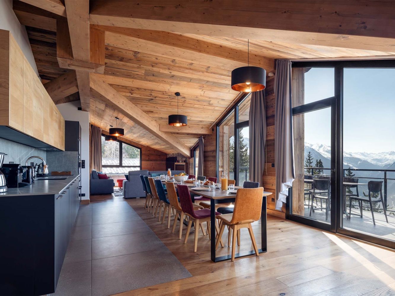 Living room with spacious sitting area with flat-screen television and electric fireplace with LCD screen. The dining area has a large table and the fully modern equipped kitchen includes a stove, refrigerator, microwave, filter coffee maker, Nespresso coffee maker, kettle and dishwasher.
