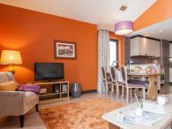 Living room with a sitting area with 2-person sofa bed, television and a dining table. Fully equipped kitchen with a refrigerator, stove, Nespresso coffee maker, kettle, microwave and dishwasher. Furthermore, this apartment has a balcony or terrace (in winter 2022/2023 the balconies are NOT accessible for security reasons) , safe and Wi-Fi internet connection.