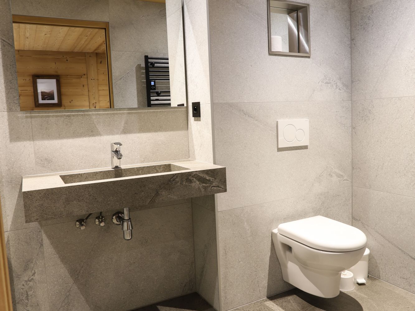 In total, there are 6 bedrooms. Three bedrooms each with two single beds (90 x 200 cm - can be pushed together as a double bed) with en-suite bathroom with shower and toilet. One bedroom with two single beds (90 x 200 cm) and a bunk bed (80 x 190 cm) with en-suite bathroom with shower and toilet. One bedroom with three single beds (90 x 200 cm) with en-suite bathroom with shower and toilet. A bedroom with two single beds (90 x 200 cm) with en-suite bathroom with shower and toilet (this bedroom is located on the second floor of the chalet and is only accessible via the elevator or common stairs within the chalet).
