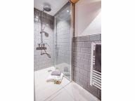 On the second floor you will find a bright, attractively furnished living room with a sitting area with wood-burning stove, Smart TV, Sonos sound system, a large dining table and a modern open kitchen with a stove, American fridge, freezer, oven, microwave, Nespresso coffee machine, kettle, toaster and dishwasher. From the living room you have access to the garden with outdoor whirlpool. Furthermore, the chalet has a laundry room with washer and dryer, ski storage with ski boot dryer, hairdryers and Wi-Fi internet connection.