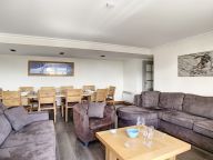 Comfortably furnished living room with sitting area with sleeping accommodation for 2 people, television and dining area. Kitchenette equipped with electric hotplates, coffee maker, kettle, toaster, refrigerator, combination microwave and dishwasher.