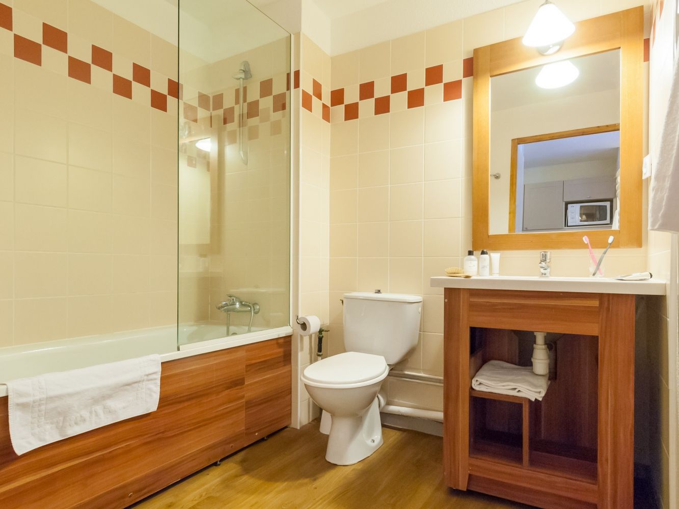 The apartments Les Temples du Soleil are spread over two buildings and have a simple design. All apartments have a Wi-Fi internet connection (high-speed internet at a charge) and a balcony with a beautiful view of the mountainous surroundings. The residence has several facilities, such as a wellness area (for a fee, children under 18 years only allowed under adult supervision) with a sauna, hammam, two whirlpools and fitness equipment, a small supermarket, sports shop, bar, restaurant, kids club and laundry. Please note that the wellness area is open for the winter season from December 25.