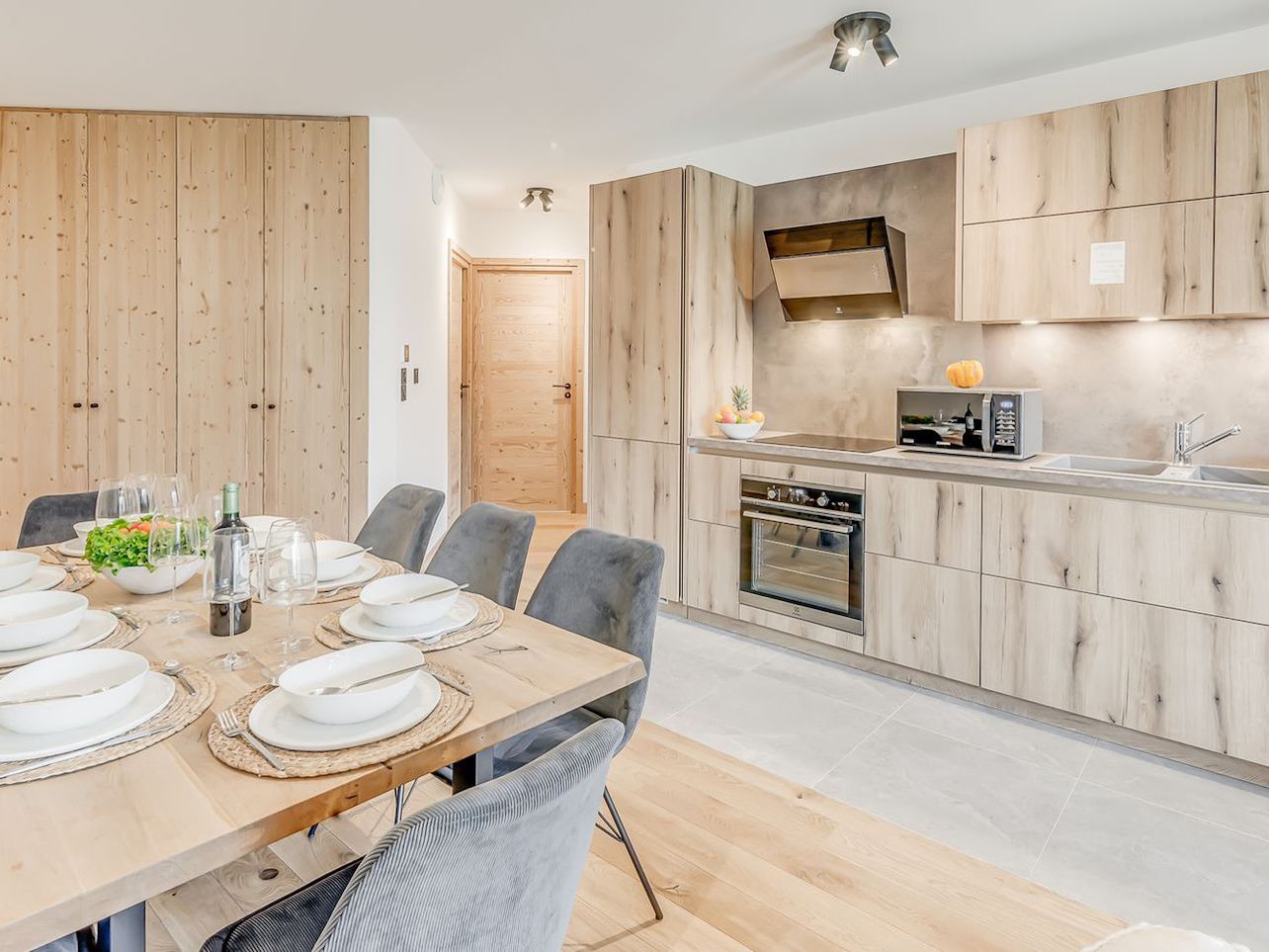 Comfortable living room with a double sofa bed, television and pellet stove. Through the living room there is access to the balcony. Open kitchen with, among other things, a dining table, induction hobs, oven, microwave, coffee maker and a dishwasher.
