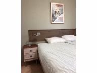 Spacious living room with a comfortable sitting area with television, a fireplace and a large dining table. Kitchen with bar and fully equipped with electric hotplates, fridge with freezer, dishwasher, oven, microwave, filter coffee maker and a kettle, among other things. The living room has large windows, which provides plenty of light. From the living room you have access to a spacious balcony with beautiful views over the Tarentaise Valley.