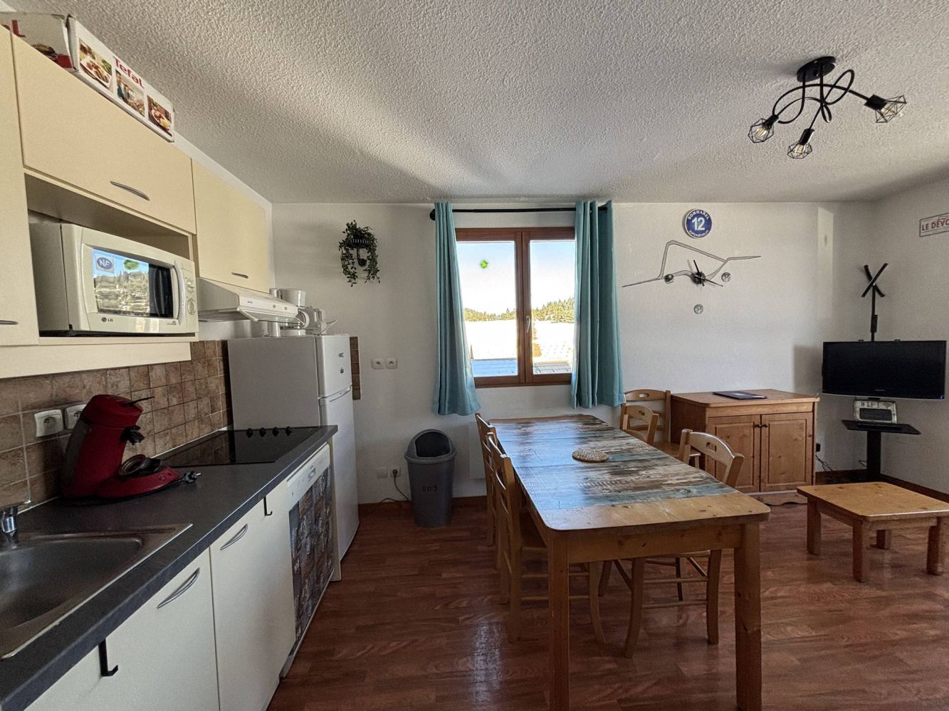Comfortably furnished living room with double sofa bed, television and dining area. Small kitchen equipped with a stove (4-burner), refrigerator (with freezer), microwave, coffee maker and dishwasher, among other things. Furthermore, most apartments have a balcony and there is Wi-Fi and a shared ski storage room.