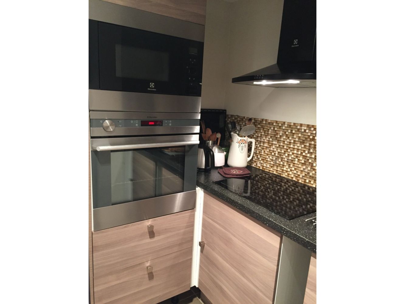 Spacious living room with a 2-person sofa bed, television, fireplace and dining table. Kitchen with three burner induction hob, refrigerator (with freezer compartment), microwave, oven, raclette set, fondue set and dishwasher.