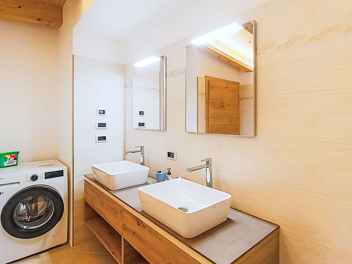 On the top floor are the 4 bedrooms. There are two bedrooms with twin beds, one with double bed and one with double bed and en-suite bathroom with shower and toilet. There is also a bathroom with double sinks, shower, toilet and washing machine. Access to the balcony with beautiful mountain views.