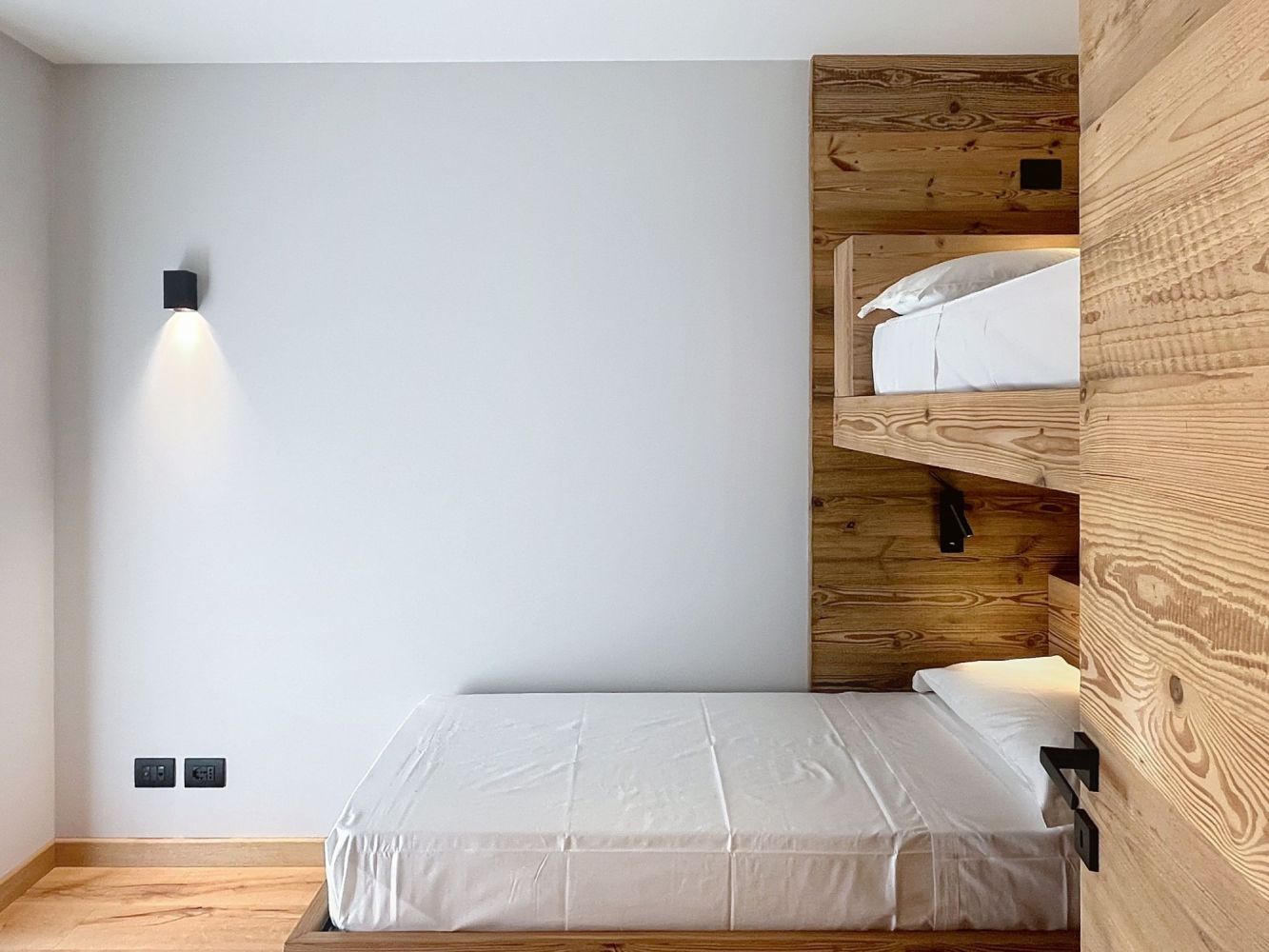 Bedroom with double bed (160x190cm), bedroom with two single beds (80x190cm), one of which is a high sleeper and bathroom with shower and toilet.