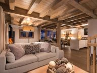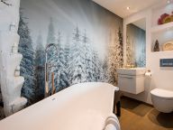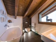 On the first floor there is a spacious, light living room with large windows. The living room has a comfortable sitting area with wood stove, a second sitting area with television and surround set, a dining area and an open kitchen with bar, fully equipped with a stove, refrigerator, oven, microwave and dishwasher. Furthermore, this chalet has, among other things, a Wi-Fi internet connection, washing machine and dryer, ski storage with ski boot dryer, floor heating and a large balcony with outdoor whirlpool and garden furniture.