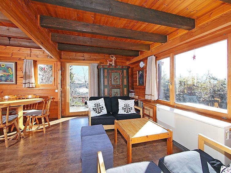Cozy living room with a sitting area, television (Swiss channels only), DVD player, dining table and an open kitchen equipped with a stove, refrigerator, oven, microwave, fondue set and dishwasher, among other things. Furthermore, this chalet has a Wi-Fi internet connection and terrace.